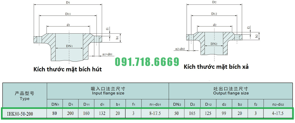 Kích thước mặt bích của máy bơm cánh hở li tâm trục ngang IHK80-50-200 đường thoát 50 mm