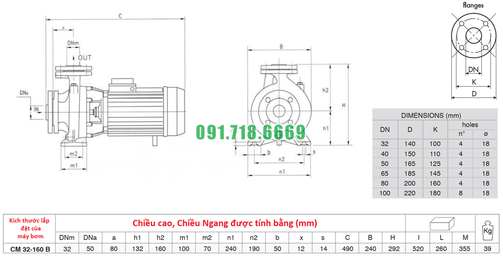 Kích thước máy bơm nước li tâm CM32-160B đường kính đầu vào ra DN50