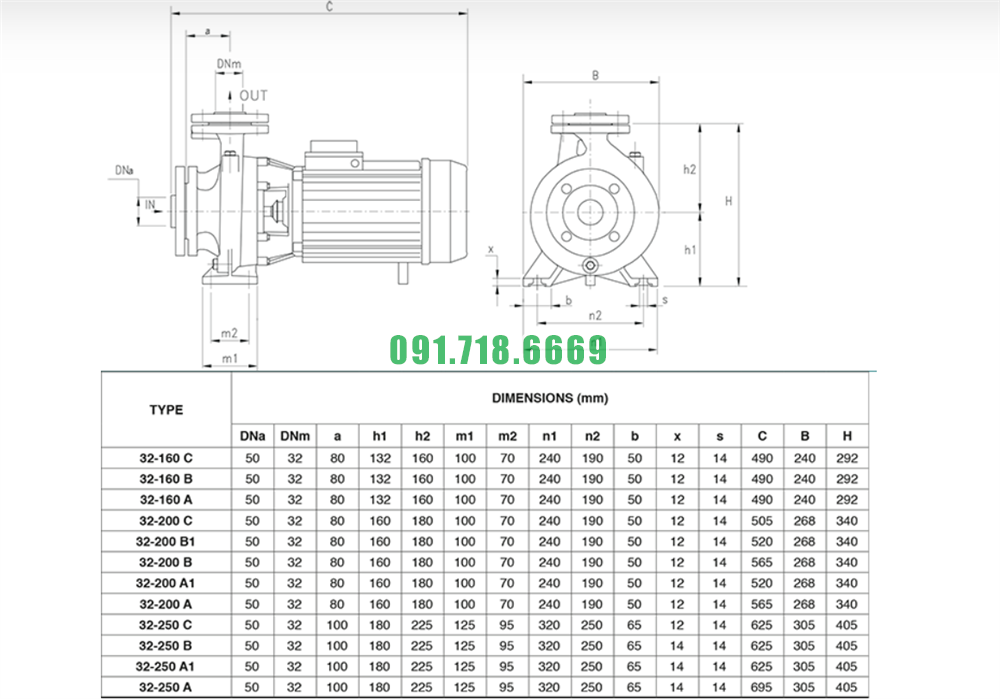 Thông số kỹ thuật máy bơm nước li tâm CM32-160C đường kính đầu vào ra DN50