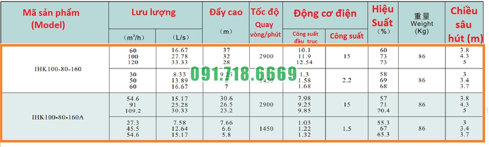 Bảng lưu lượng của máy bơm nước li tâm trục ngang cánh hở IHK100-80-160 vật liệu inox 304