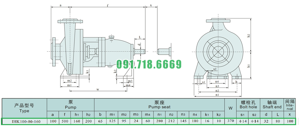 Kích thước của đầu máy bơm nước li tâm trục ngang cánh hở IHK100-80-160 vật liệu inox 304