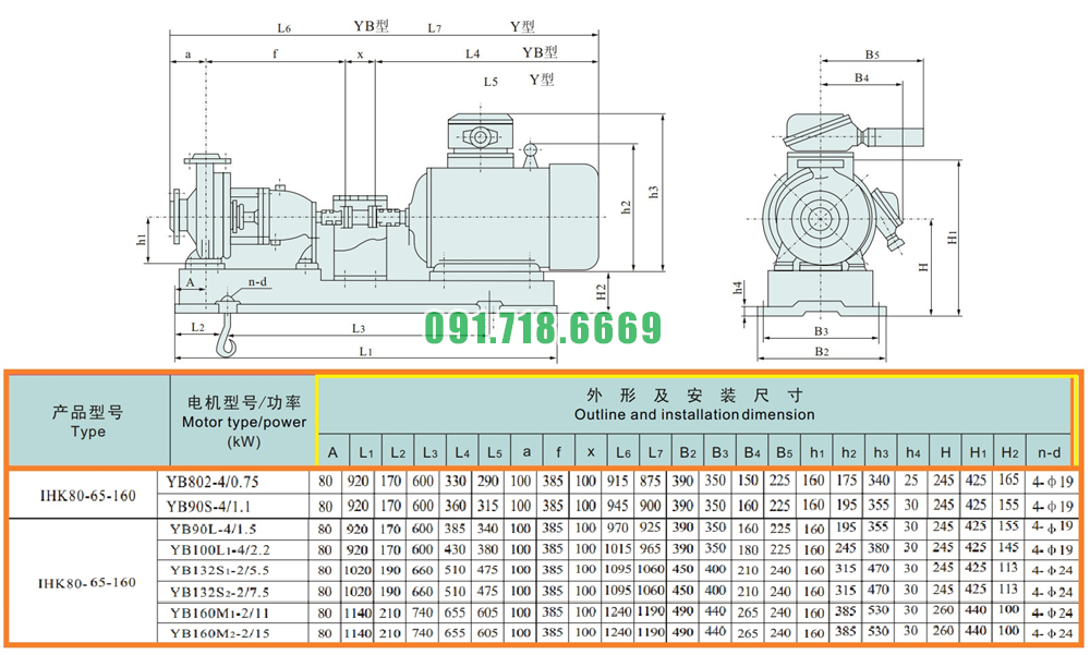 Kích thước lắp đặt của máy bơm nước li tâm trục ngang cánh hở IHK100-80-160 vật liệu inox 304