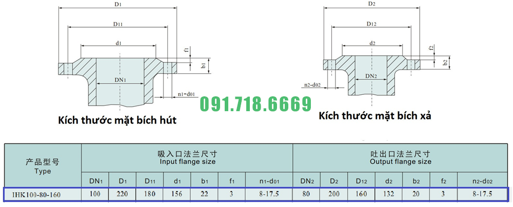 Kích thước mặt bích của máy bơm nước li tâm trục ngang cánh hở IHK100-80-160 vật liệu inox 304