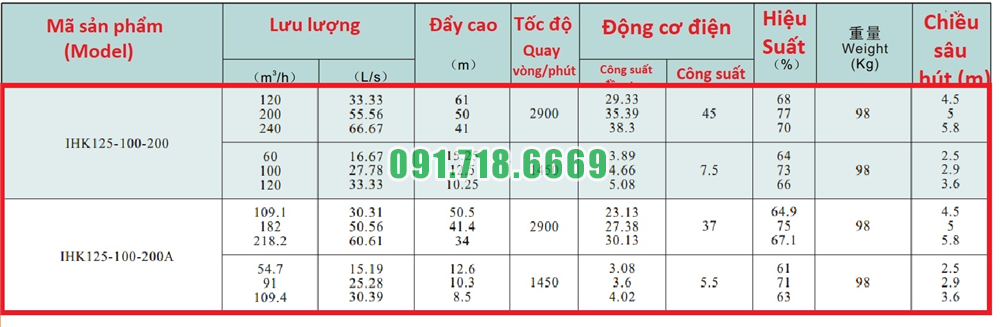 Bảng lưu lượng của máy bơm nước li tâm trục ngang cánh hở IHK125-100-200 vật liệu inox 304
