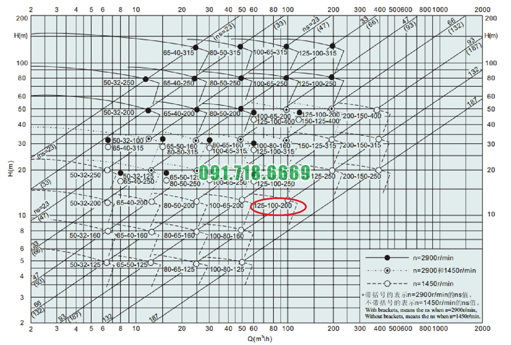 Đường cong hiệu suất của máy bơm nước li tâm trục ngang cánh hở IHK125-100-200 vật liệu inox 304