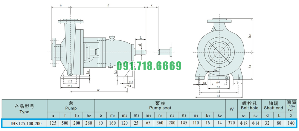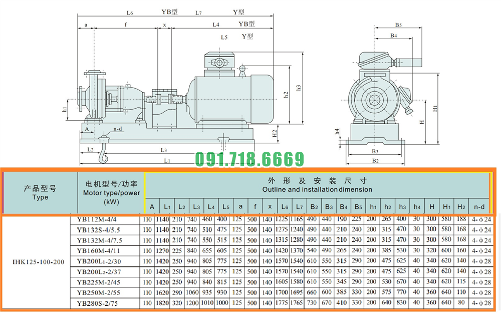 Kích thước lắp đặt của máy bơm nước li tâm trục ngang cánh hở IHK125-100-200 vật liệu inox 304