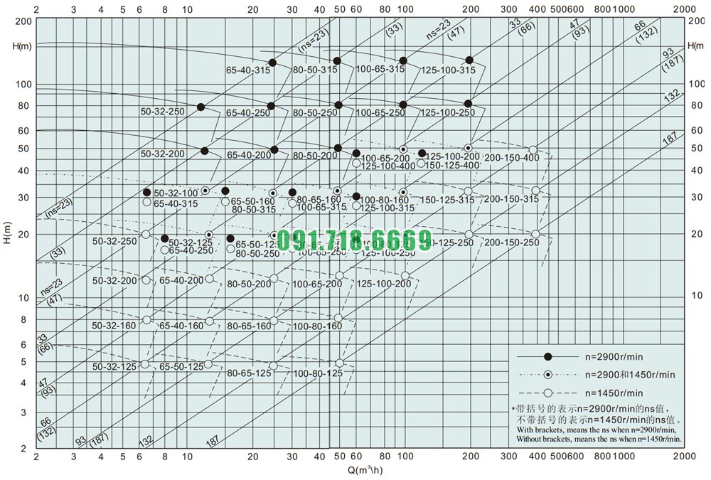 Đường cong hiệu suất làm việc của máy bơm nước li tâm trục ngang cánh hở IHK50-32-125 vật liệu inox 304
