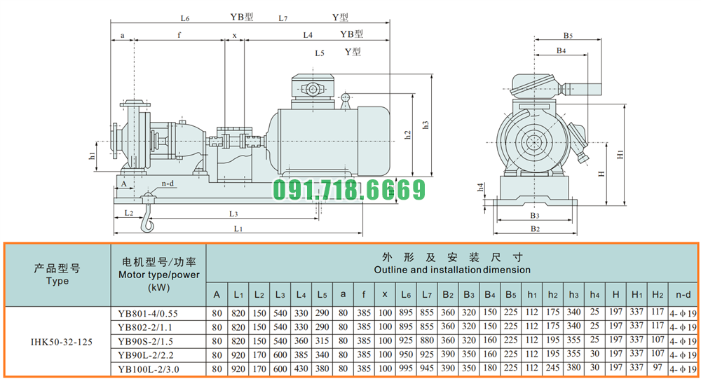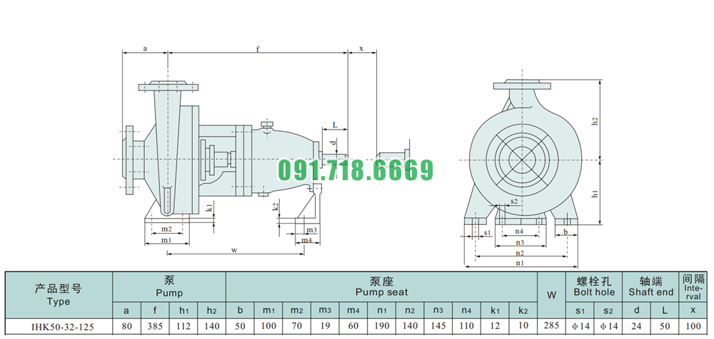 Kích thước lắp đặt của đầu bơm máy bơm nước li tâm trục ngang cánh hở IHK50-32-125 vật liệu inox 304