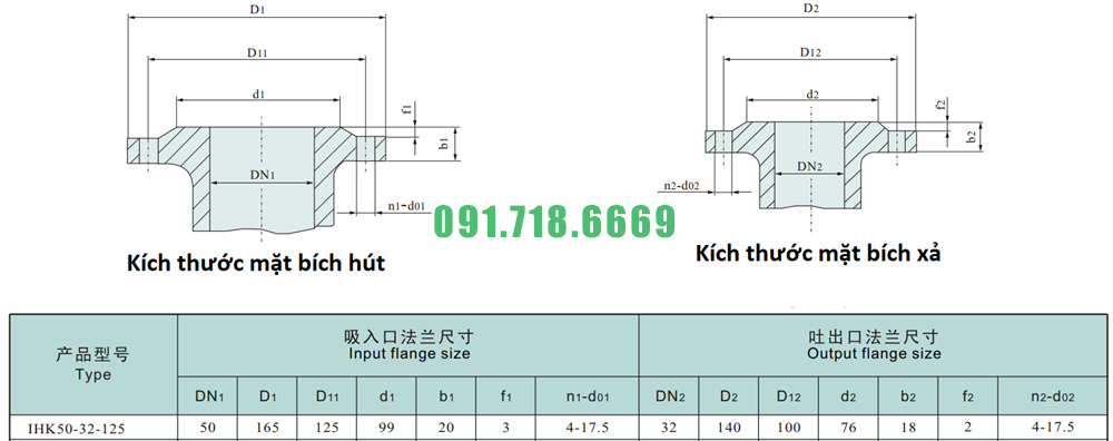 Kích thước mặt bích kết nối hút xả của máy bơm nước li tâm trục ngang cánh hở IHK50-32-125 vật liệu inox 304