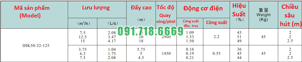 Bảng thông số lưu lượng của máy bơm nước li tâm trục ngang cánh hở IHK50-32-125 vật liệu inox 304