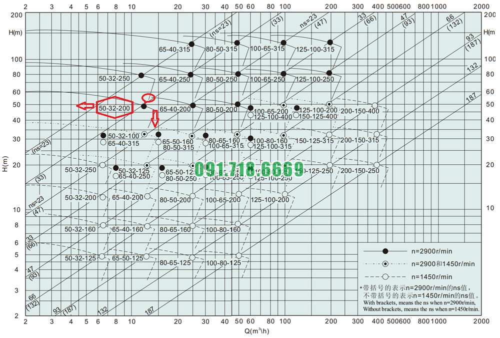 Bảng lưu lượng của máy bơm nước li tâm trục ngang cánh hở IHK50-32-200 vật liệu inox 304