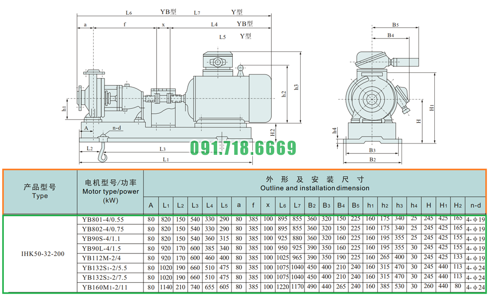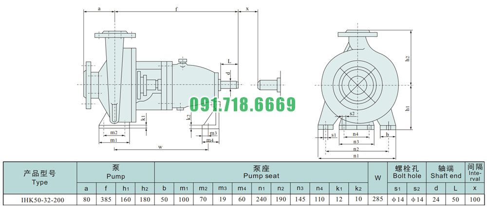 Kích thước lắp đặt của máy bơm nước li tâm trục ngang cánh hở IHK50-32-200 vật liệu inox 304