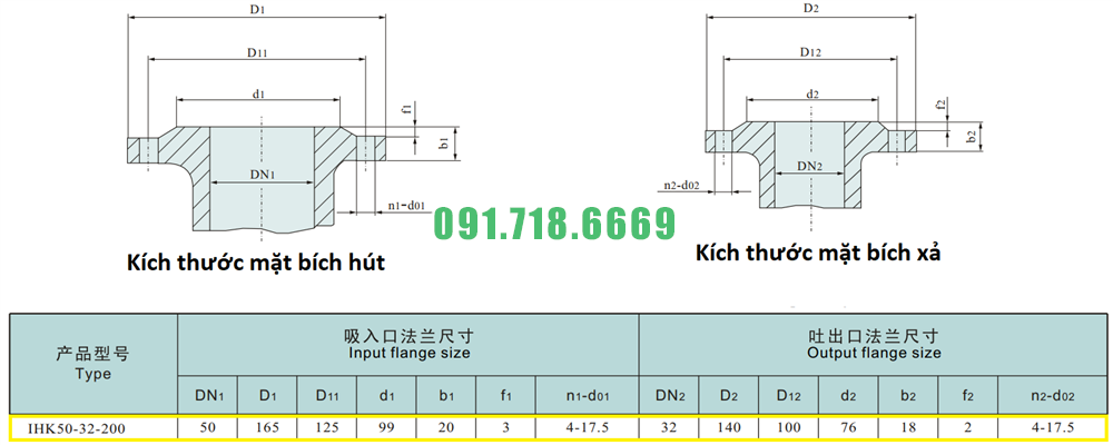 Kích thước mặt bích của máy bơm nước li tâm trục ngang cánh hở IHK50-32-200 vật liệu inox 304