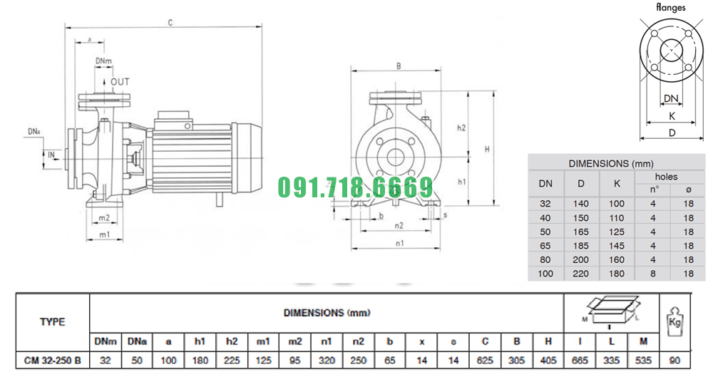 Kích thước máy bơm nước li tâm trục ngang CM32-250B vỏ gang FC200