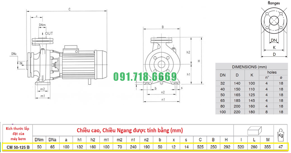 Kích thước máy bơm nước li tâm trục ngang CM50-125B vỏ gang FC200