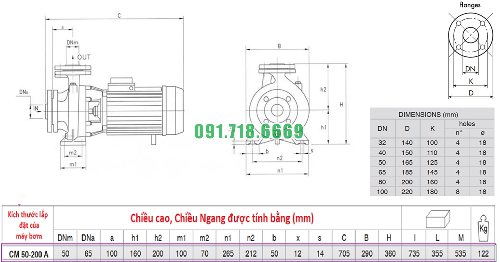 Kích thước máy bơm nước li tâm trục ngang CM50-250C đường thoát 40 mm